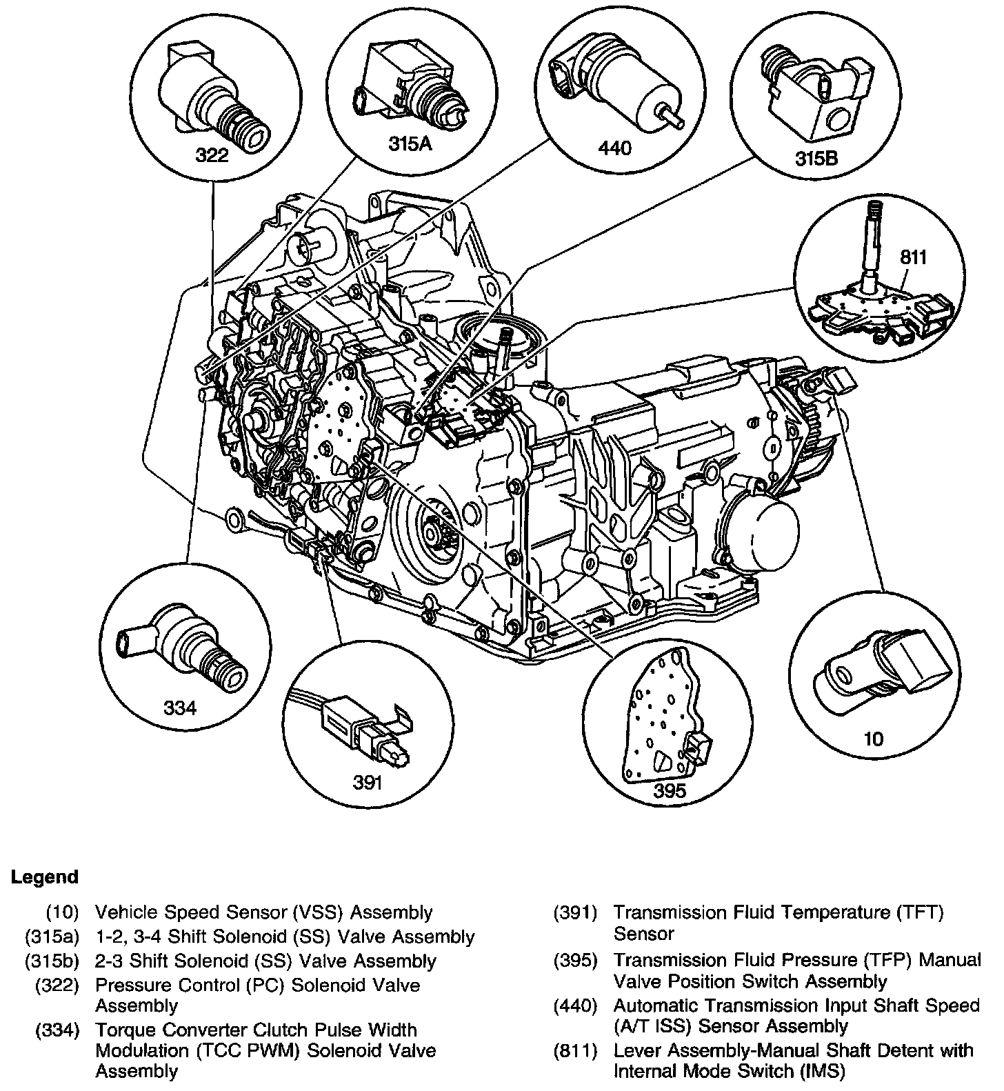 This transmission uses either an externally mounted Transmission Range Switch (TR), Park Neutral Position Switch (PNP) located on the manual valve selector shaft, or an internally mounted Internal Mode Switch (IMS) located inside the automatic transmission, item number 811 in the image.