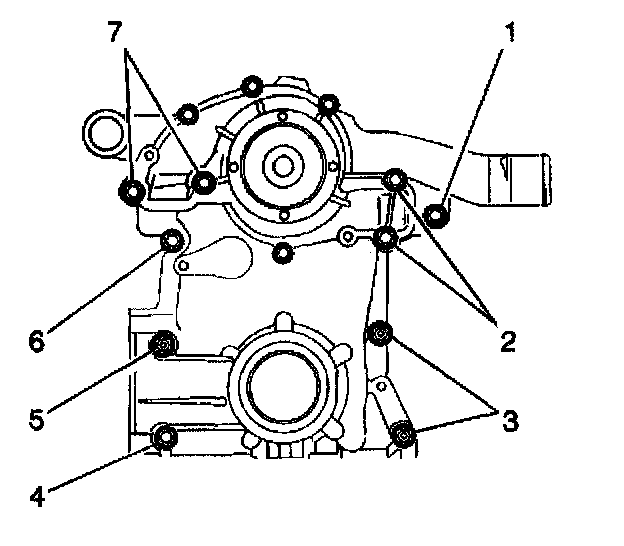 12. Install the engine front cover bolts (1-7).