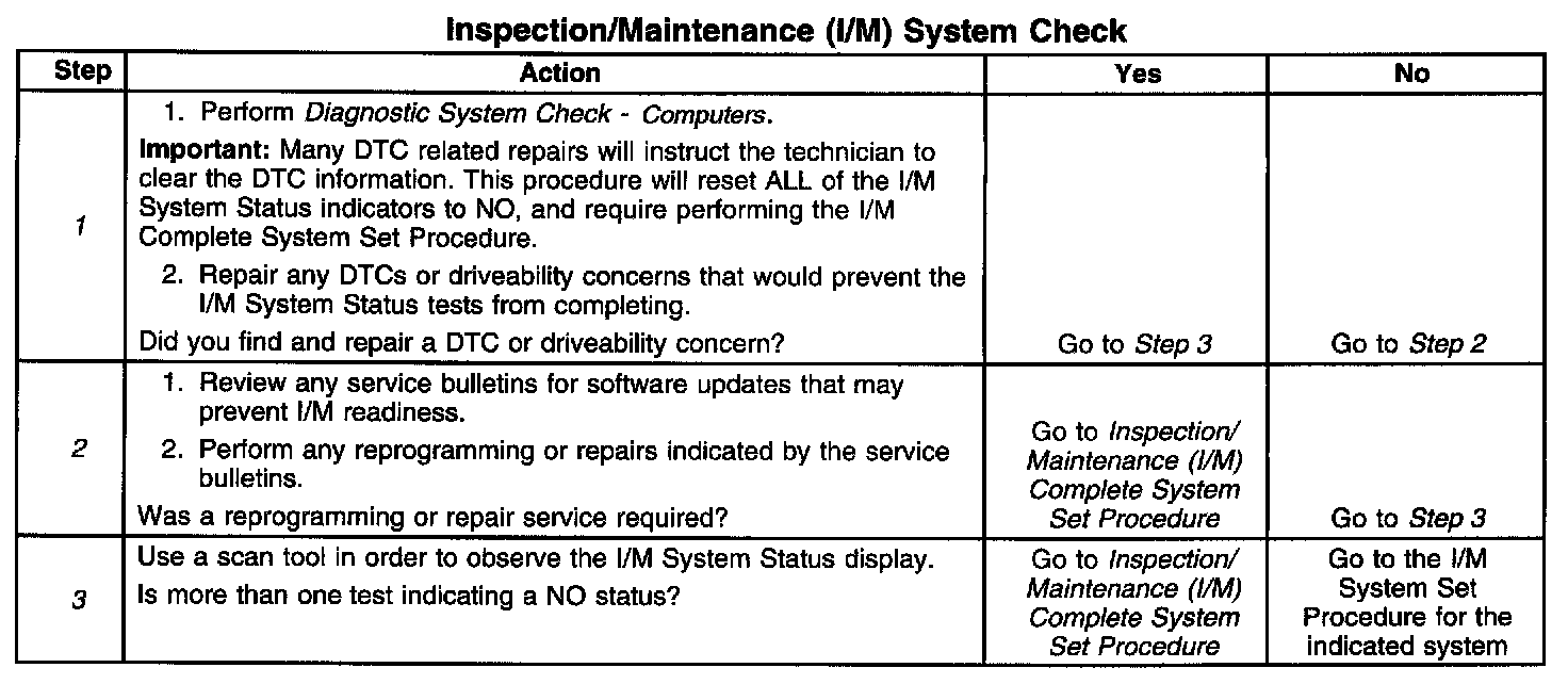 2. Anytime a control module is reprogrammed or the diagnostic trouble codes are cleared as part of a repair procedure, all the I/M System Status indicators will reset to NO.