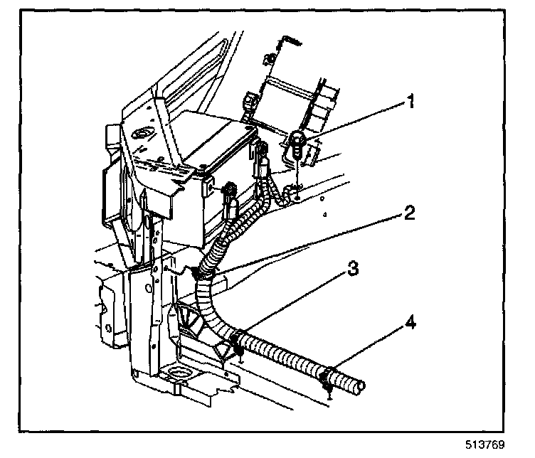 2. Install the battery cable harness to the harness retainers (2,3,4).