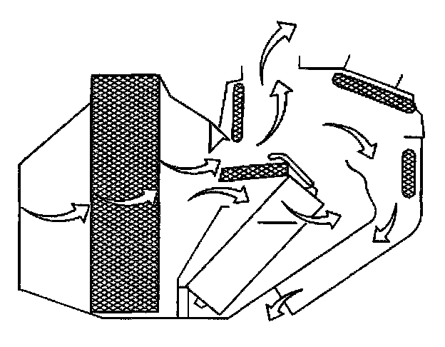 Most of the air flows through the floor outlets. A small amount of air flows through the defroster duct and the side window defoggers.