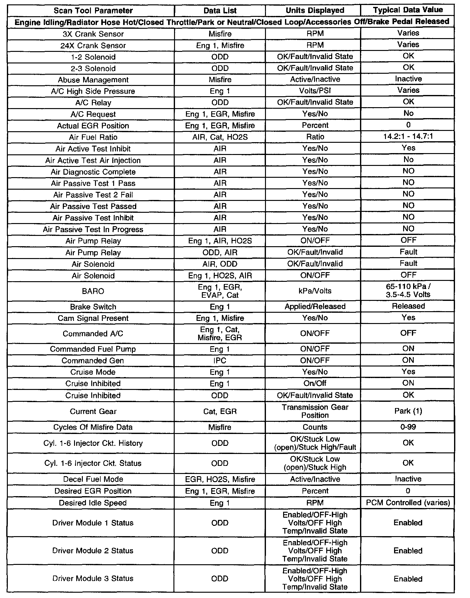 The column labeled Data List indicates where a parameter can be located on the scan tool. Refer to the scan tool operating manual for the exact locations of the data lists. The following is a description of each term listed: