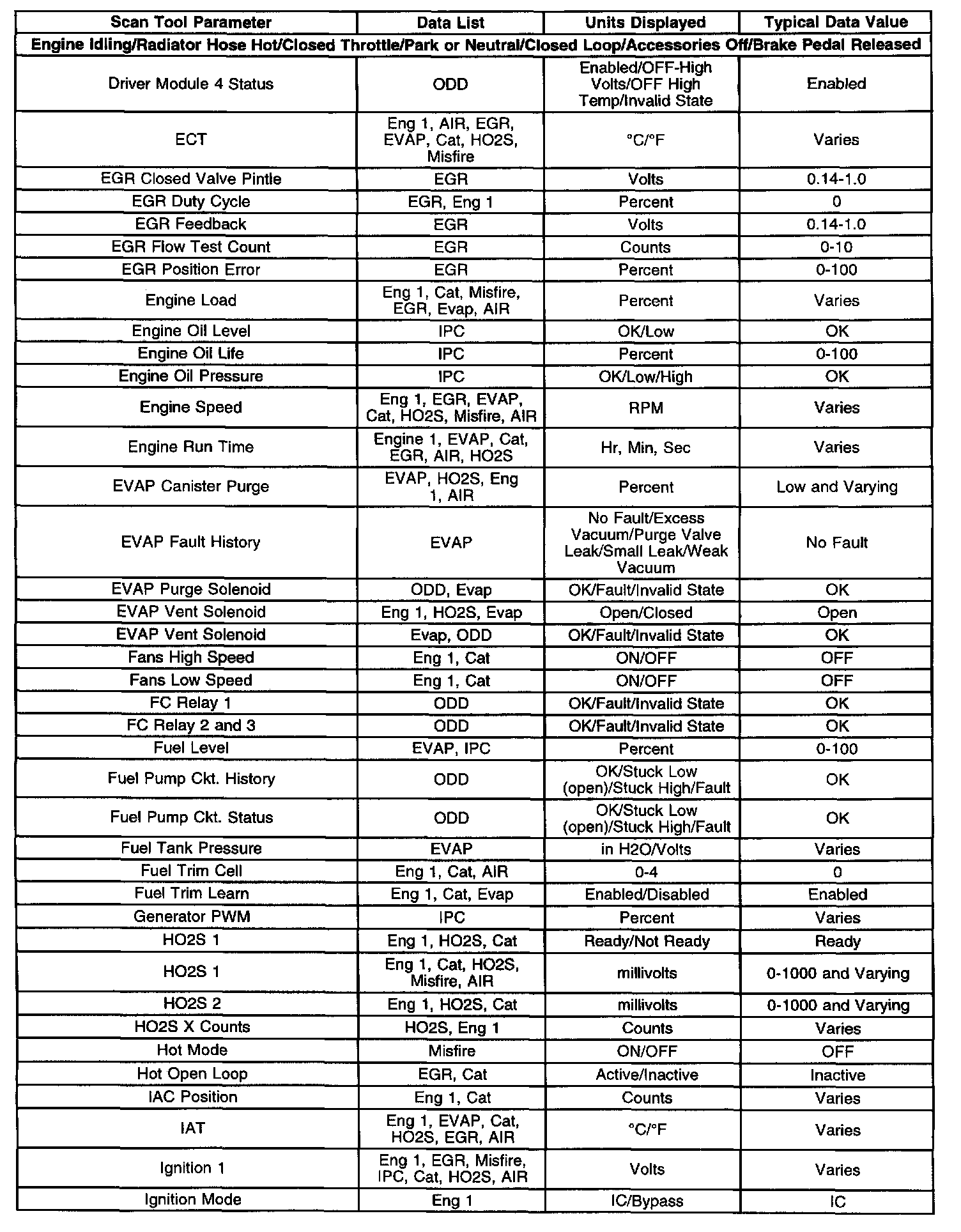 The Engine Scan Tool Data List contains all engine related parameters that are available on the scan tool. The list is arranged in alphabetical order. A given parameter may appear in any one of the data lists, and in some cases may appear more than once, or in more than one data list in order to group certain related parameters together.