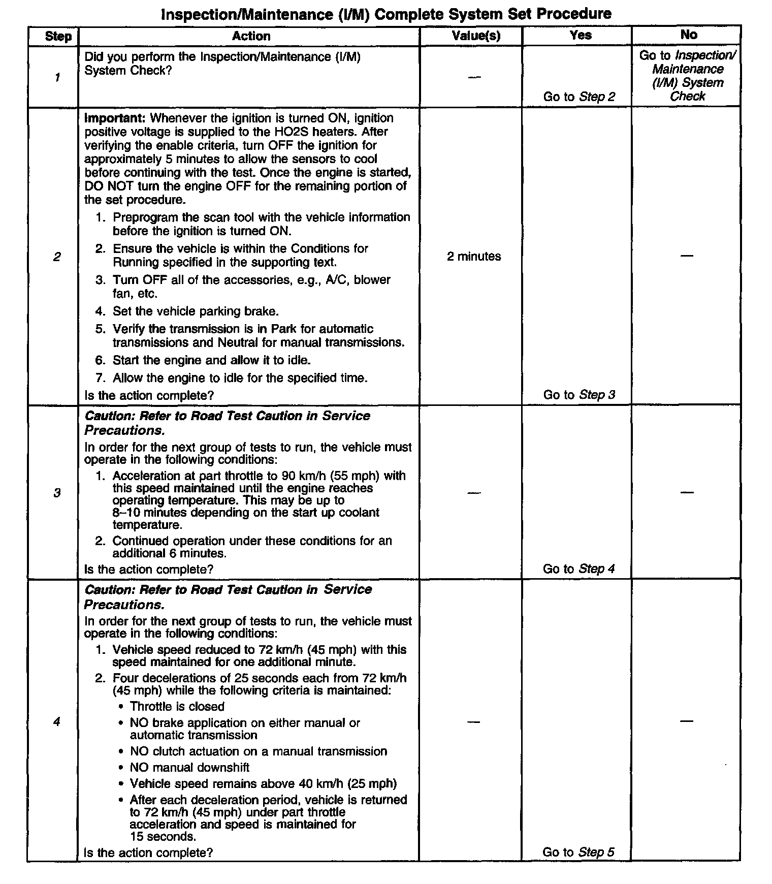 DESCRIPTIONThe purpose of the I/M complete system set procedure is to satisfy the enable criteria necessary to execute all of the I/M readiness diagnostics, and complete the trips for those particular diagnostics. When all diagnostic tests are completed, the I/M System Status indicators are set to YES. Perform this test when more than one or all of the I/M System Status indicators are set to NO.