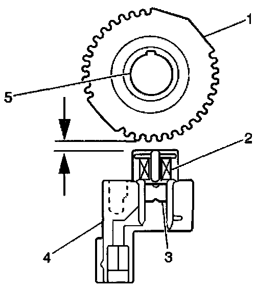 The CKP sensor (4) generates a magnetic field within the magnet (3) and coil (2) assembly. The CKP sensor has a specified air gap between the sensor core end and the crankshaft signal rotor (1) that is located on the end of the crankshaft (5). An AC voltage (pulse) is generated in the sensor when crankshaft rotation causes a change in the magnetic flux. The CKP sensor sends the signal to the Powertrain Control Module (PCM). The PCM uses CKP sensor input in order to initiate engine ignition and fuel delivery.