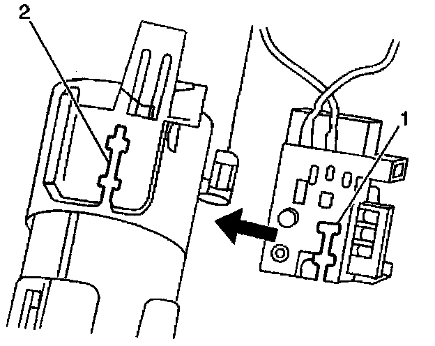 1. Insert the tab (1) on the fuel level sensor assembly into the channel (2) on the fuel sender assembly. Slide the sensor up until the sensor locks in place.