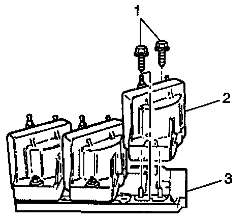 3. Remove the 2 screws (1) securing the ignition coil (2) to the ignition control module (3).