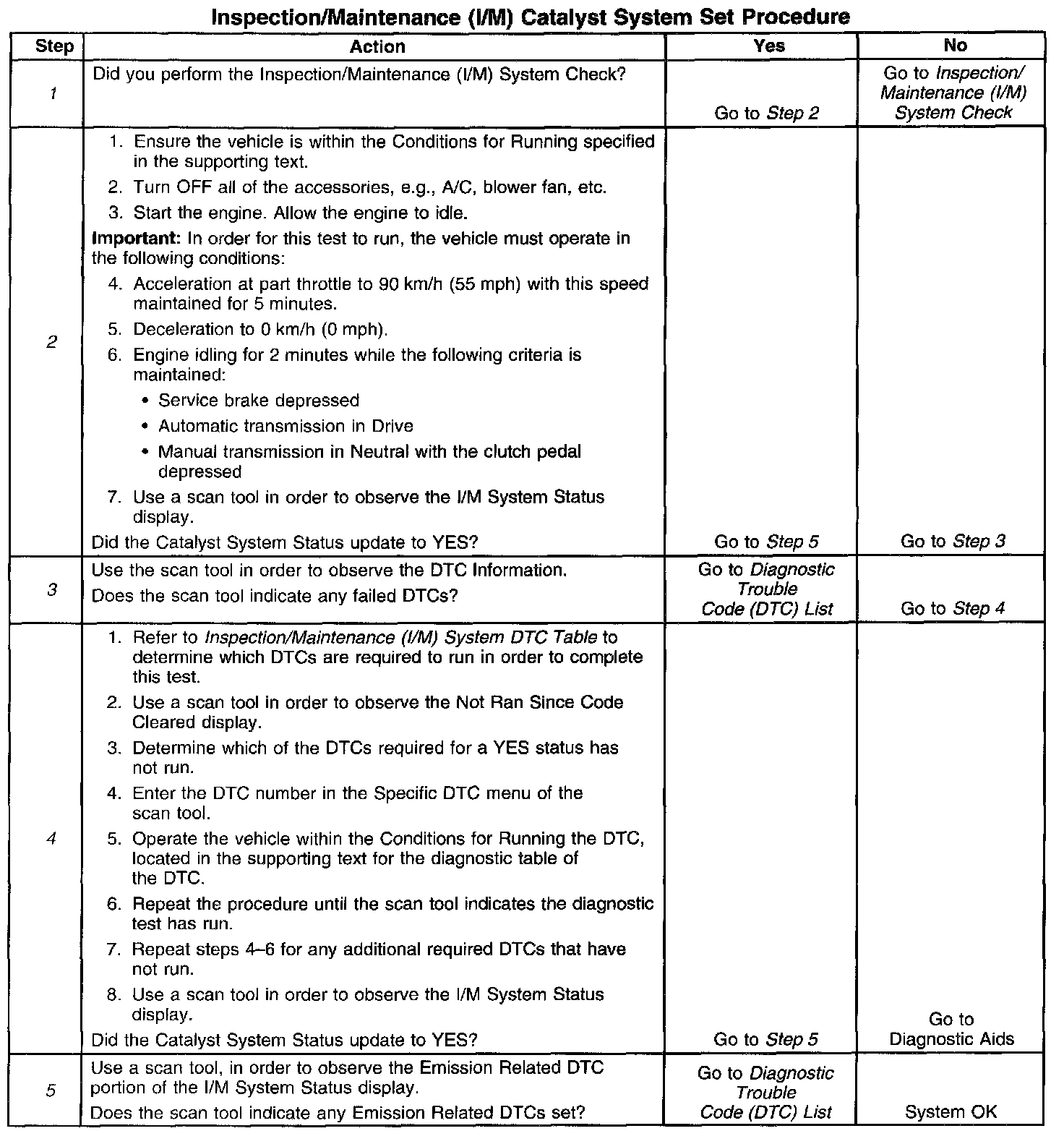 3. This step is to identify a first failure of a type B DTC. A DTC only appears on the I/M System Status display when the DTC becomes a MIL illuminating DTC. This occurs on the second failure of a type B DTC. A first failure of a type B DTC will not allow the I/M System Status to update to YES. Refer to Diagnostic Aids.