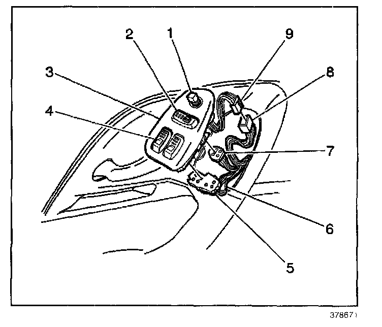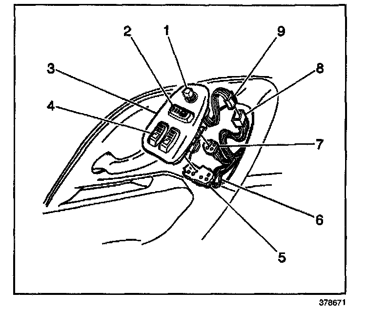 3. Disconnect the electrical connector (9) from the mirror switch (1).