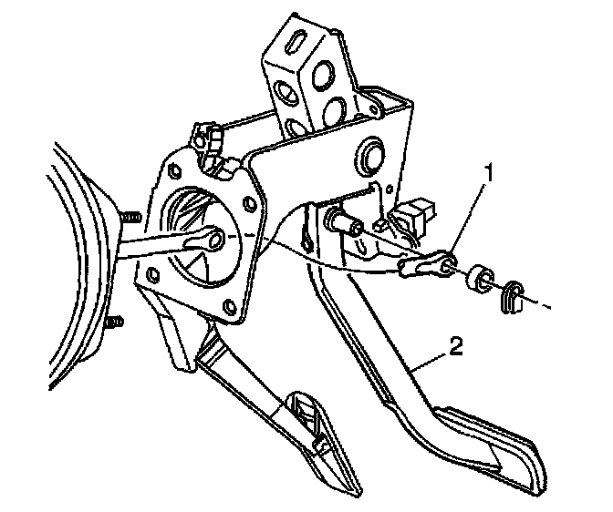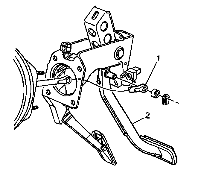 2. Disconnect the brake pedal pushrod (1) from the brake pedal (2).