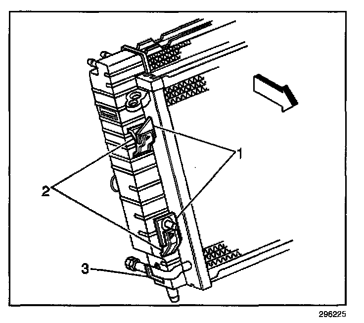 12. Raise the condenser along the radiator to release the condenser tabs (1) from the radiator slots (2).