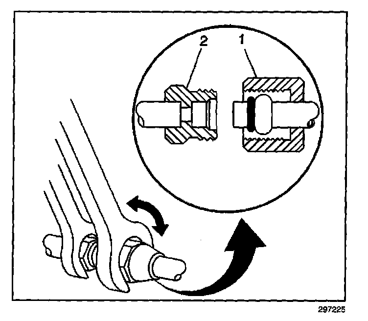 11. Using a back-up wrench on the condenser fitting (2), secure the compressor hose fitting (1) to the condenser.