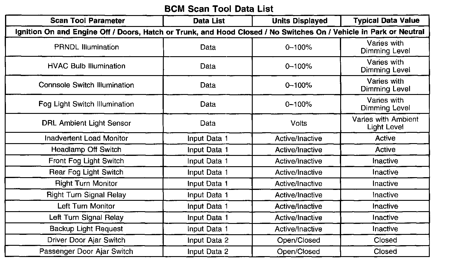 BCM Scan Tool Data List: