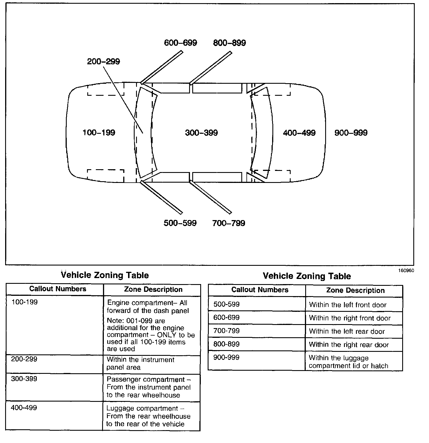 All grounds, in-line connectors, pass-through grommets, and splices have identifying numbers that correspond to where they are located in the vehicle. The table explains the numbering system.