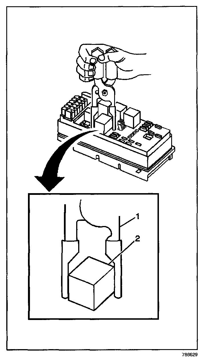 NOTE: Use J 43244 to pull the relay straight out from the electrical center terminals. The use of pliers or a flat bladed tool could damage the electrical center.