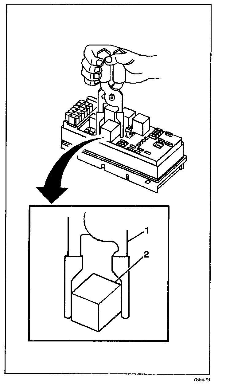 3. Using the J 43244 (1) position the tool on opposing corners of the relay (2).