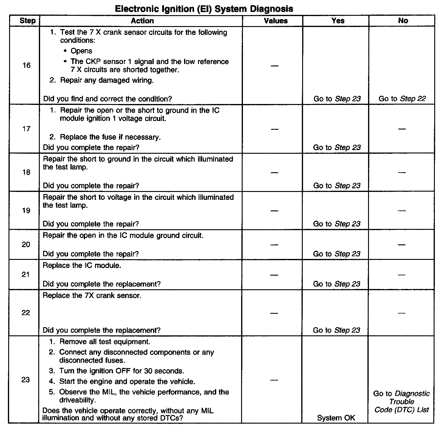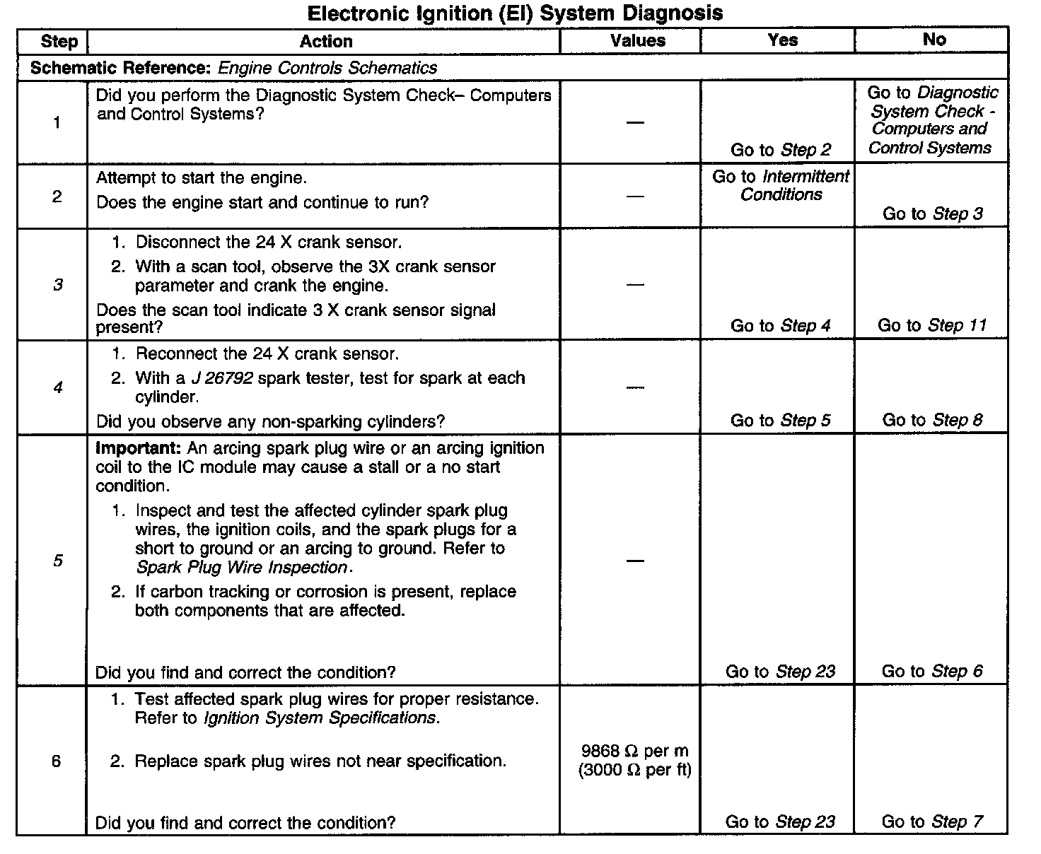 The numbers below refer to the step numbers on the diagnostic table.