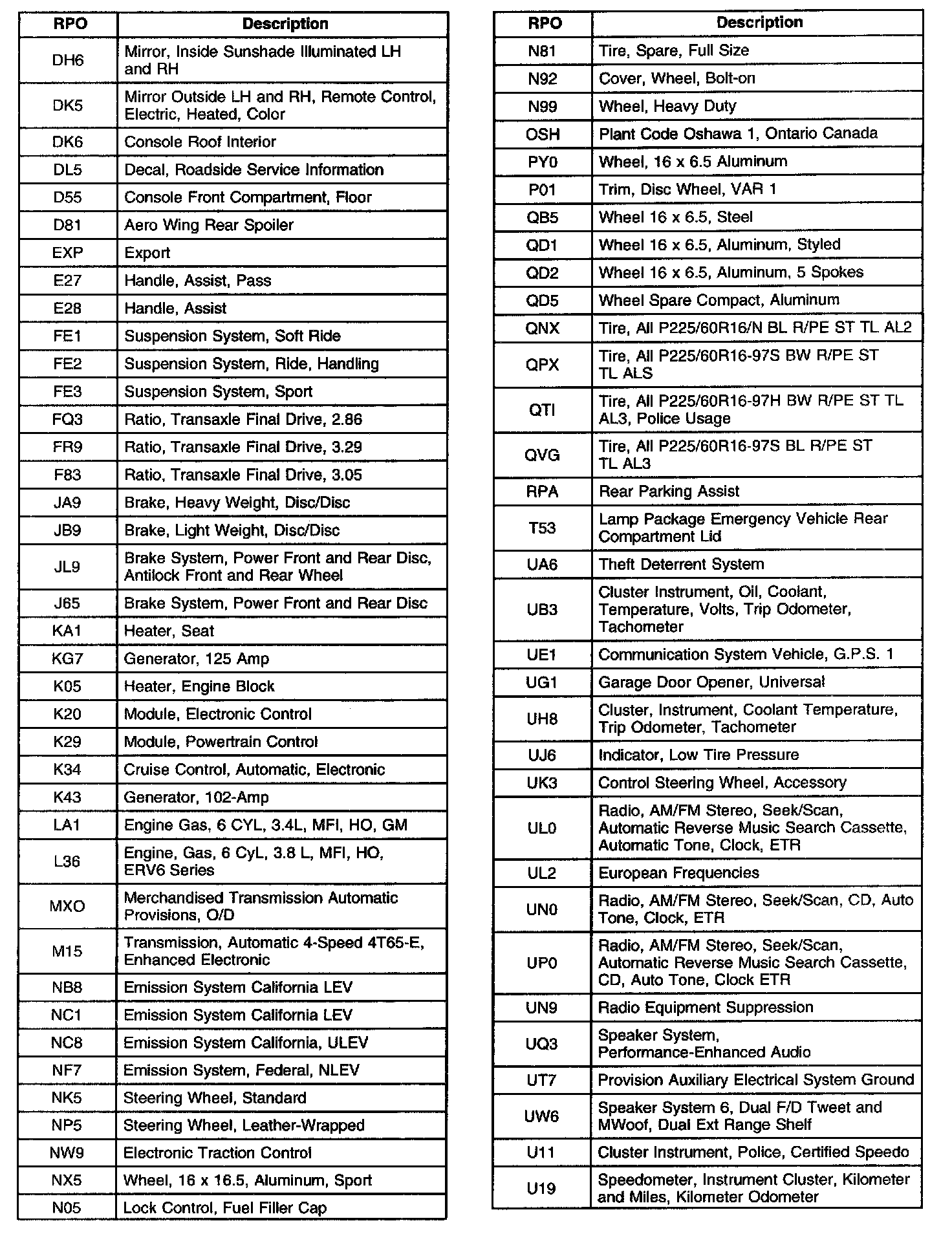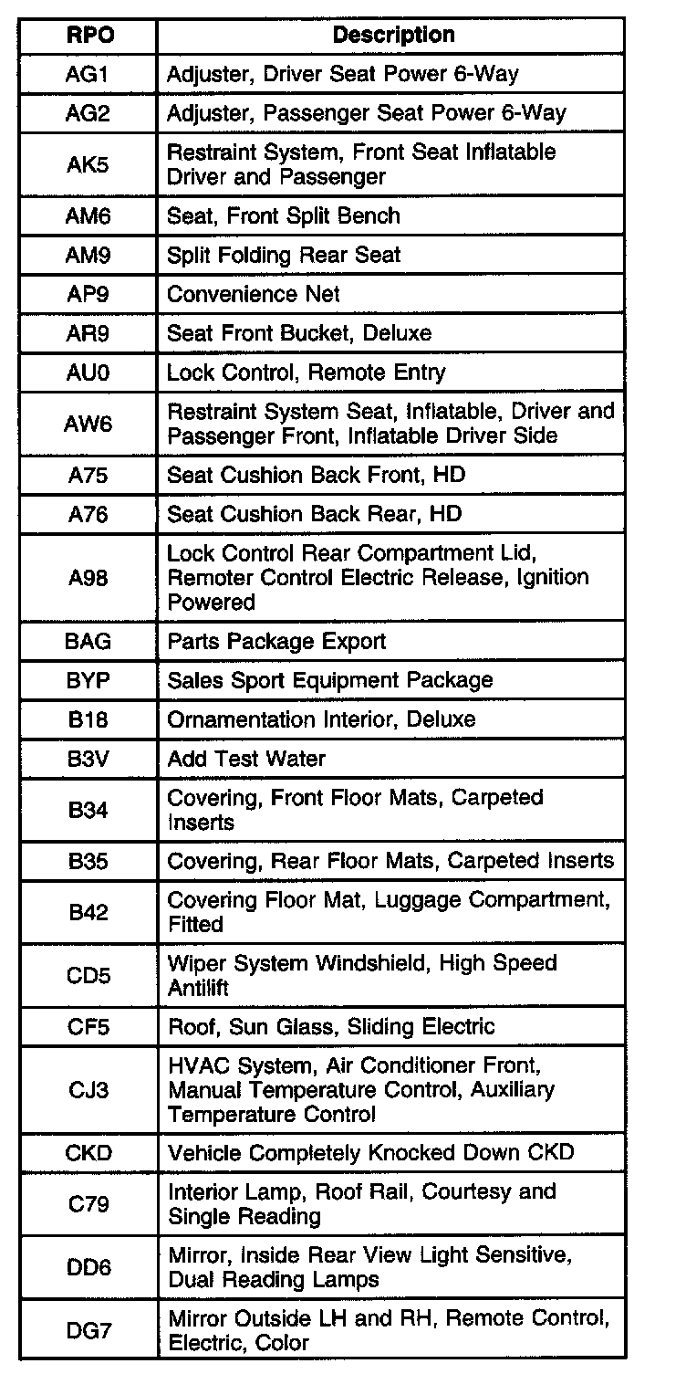 The table provides the description of the Regular Production Option (RPO) codes that are available on the vehicle. The vehicle's RPO list is printed on the Service Parts Identification Label.