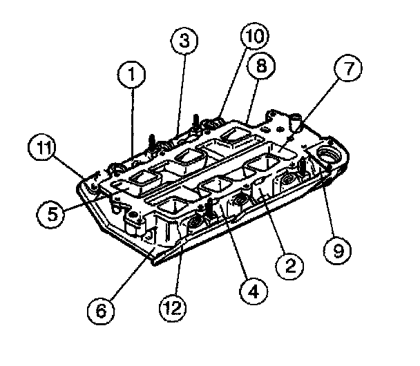 8. Install the lower intake manifold bolts (1-12). Apply thread lock compound GM P/N 12345382 or equivalent to the two hidden bolts and ensure they are installed.