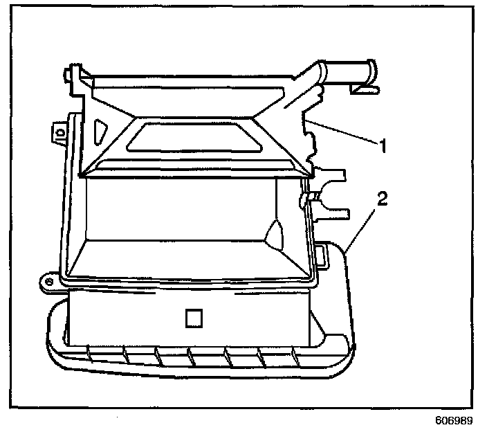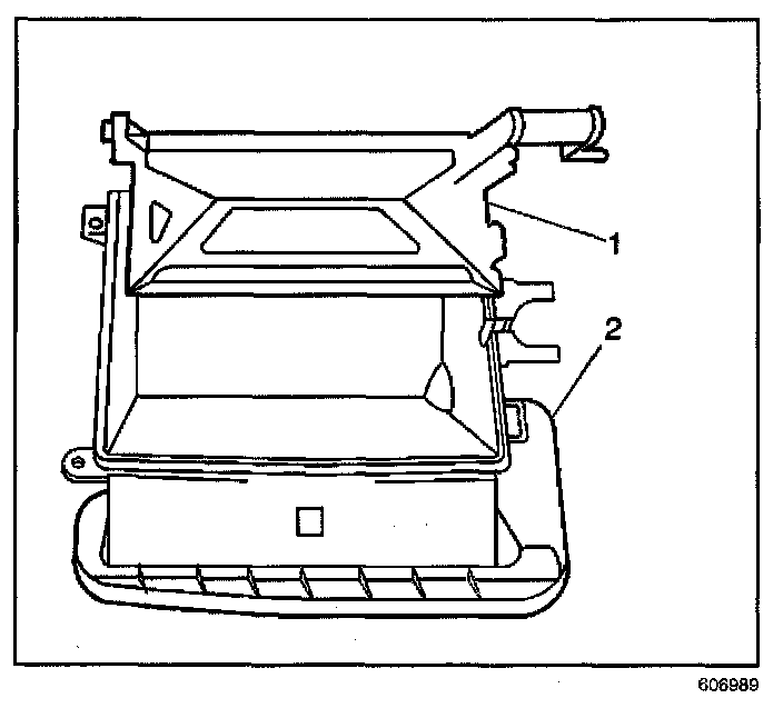 5. Remove the recirculation housing (2) from the HVAC module assembly.