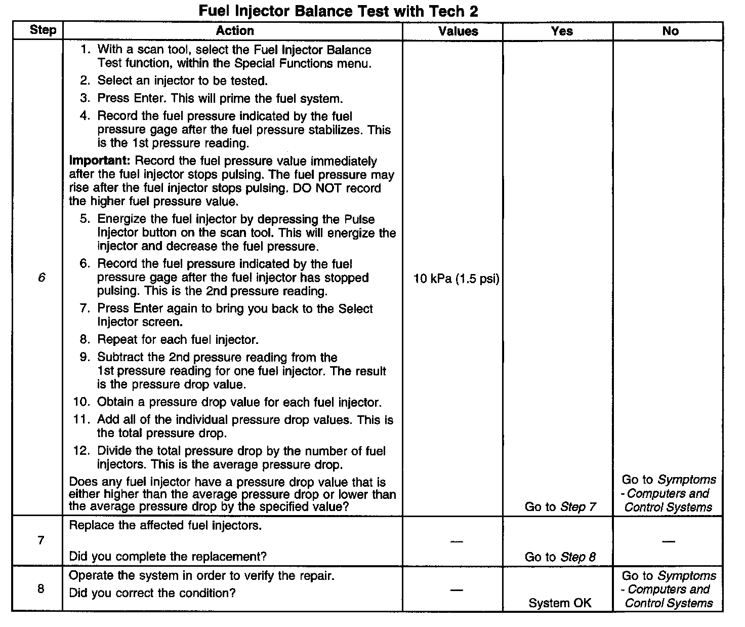 6. If the pressure drop value for each fuel injector is within 10 kPa (1.5 psi) of the average pressure drop value, the fuel injectors are flowing properly. Calculate the pressure drop value for each fuel injector by subtracting the second pressure reading from the first pressure reading.