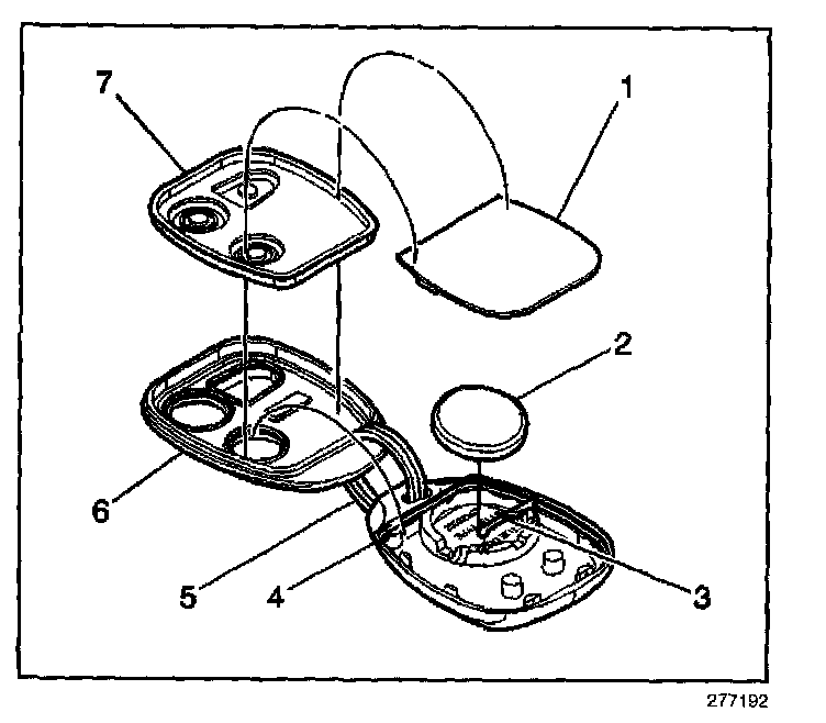 1. Insert a small bladed tool, or a small coin, at the slot provided near the key ring hole (5), between the two halves (6, 4) of the transmitter case.
