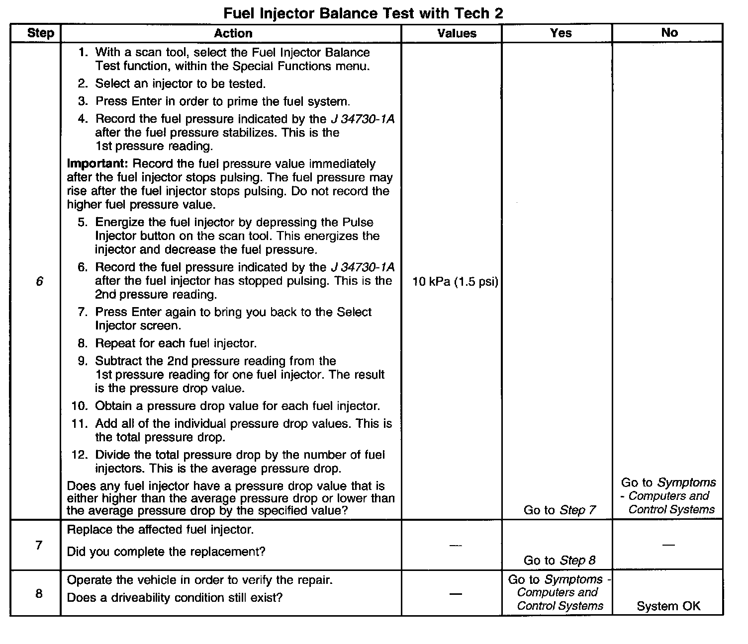 6. If the pressure drop value for each fuel injector is within 10 kPa (1.5 psi) of the average pressure drop value, the fuel injectors are flowing properly. Calculate the pressure drop value for each fuel injector by subtracting the second pressure reading from the first pressure reading. Component Tests and General Diagnostics