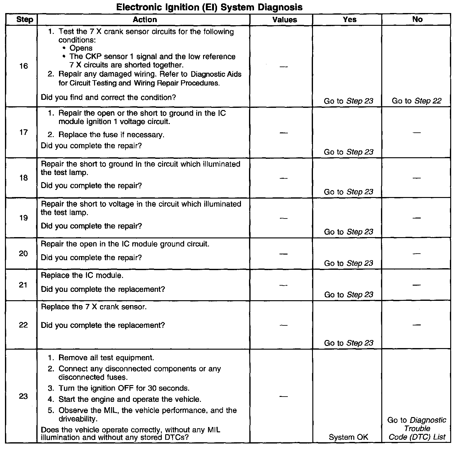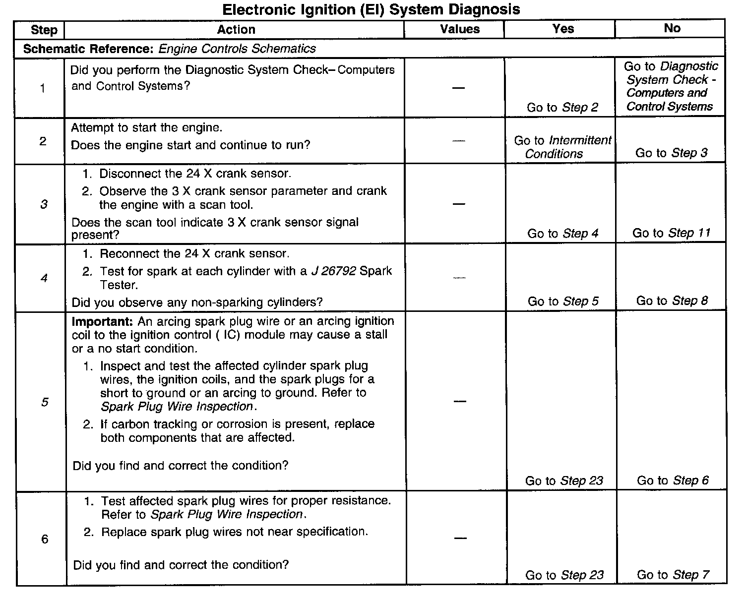 7. If the no spark condition follows the suspected coil, that coil is faulty. Otherwise the ignition module is the cause of no spark. This test can also be performed by substituting a known good coil for the one causing the no spark condition.