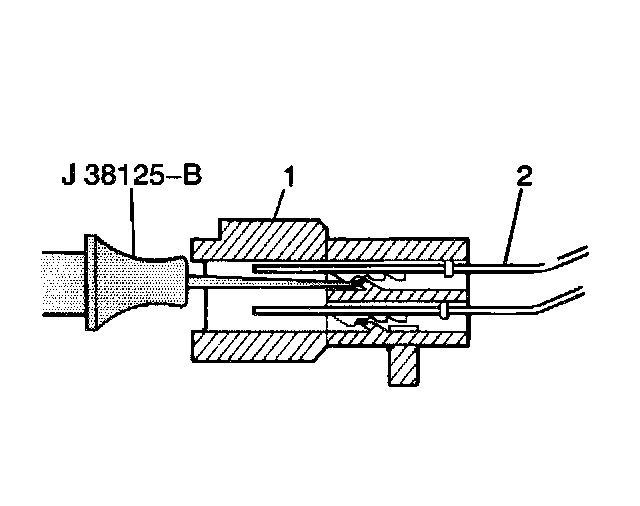 4. Remove the red/blue wire (2) from the cruise control switch electrical connector (1) with a terminal remover from the J 38125-B.