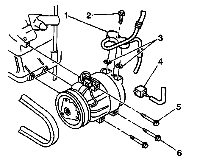 1. Install the compressor to the vehicle. Secure the compressor with the 2 lower mounting bolts (6).