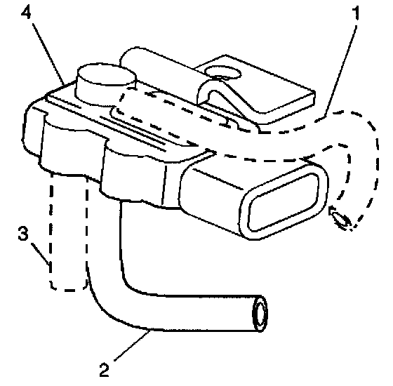 The Fuel Tank Pressure (FTP) sensor (4) contains a silicon chip that changes electrical resistance when pressure is applied. The fuel tank pressure sensor converts the positive or negative pressure that is applied to the sensor's pressure port (2) into an electrical signal. The fuel tank pressure sensor amplifies the electrical signal and sends the signal to the PCM. There are 2 fuel tank pressure sensor designs in production. Both designs incorporate a drain port that is connected to the EVAP canister drain line. The first design (1) has the drain port located on top of the sensor. The second design (3) has the drain port located behind the pressure port (2). Be sure to connect the correct hose to the correct port when servicing or replacing the fuel tank pressure sensor.
