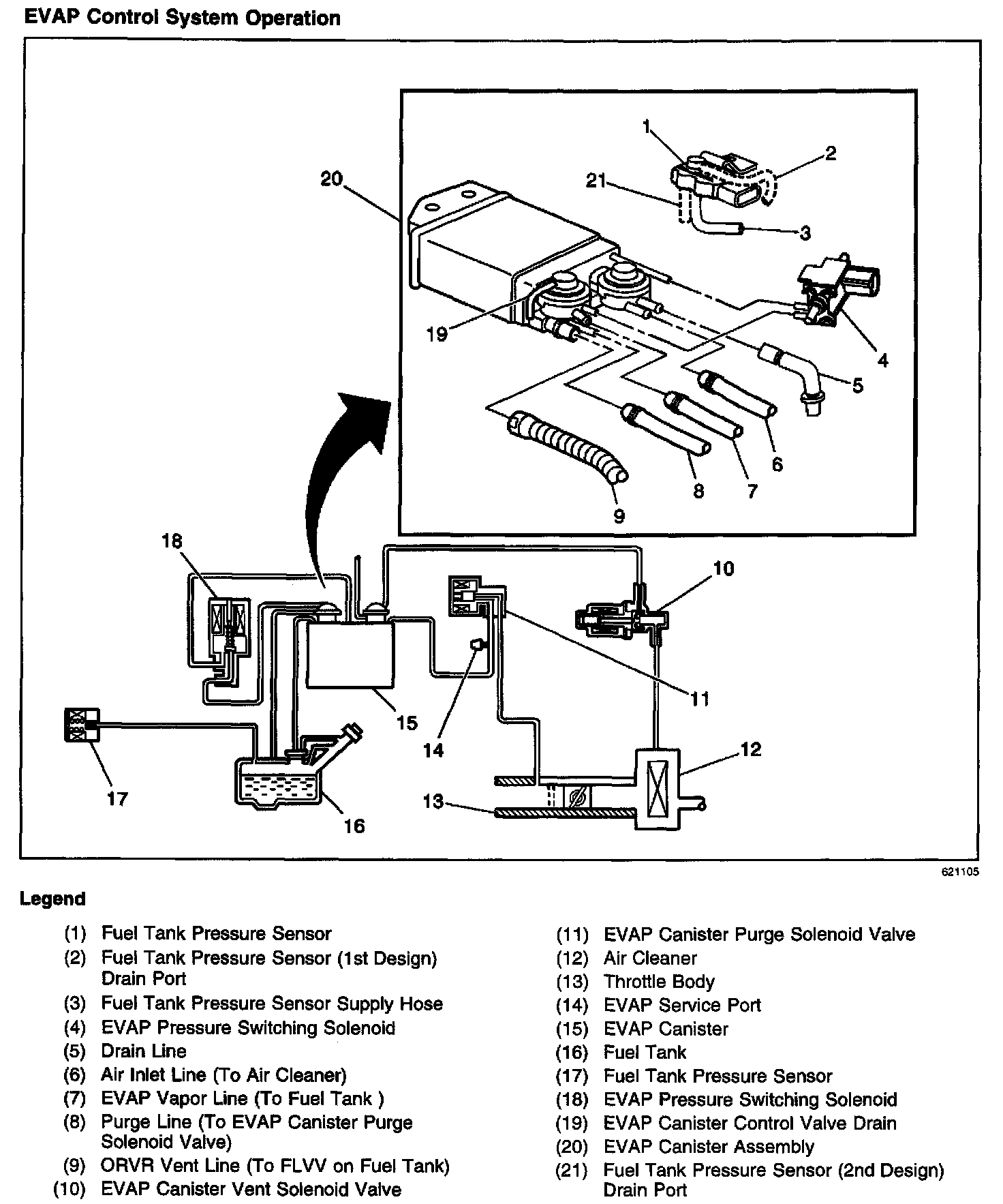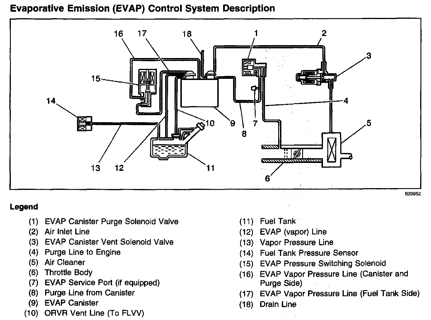 The Evaporative Emission (EVAP) control system limits fuel vapor emissions to the atmosphere. The EVAP system transfers the fuel vapor from a sealed fuel tank to an EVAP canister containing activated carbon. The EVAP canister stores the fuel vapors until the engine is able to use the vapors.