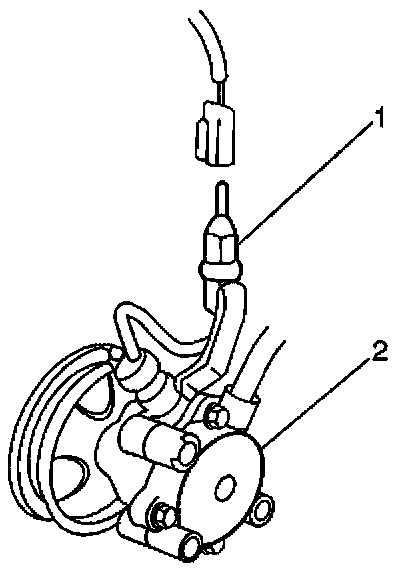 1. Install the PSP switch (1) to the steering gear inlet pipe fitting on the high pressure side of the power steering pump (2).