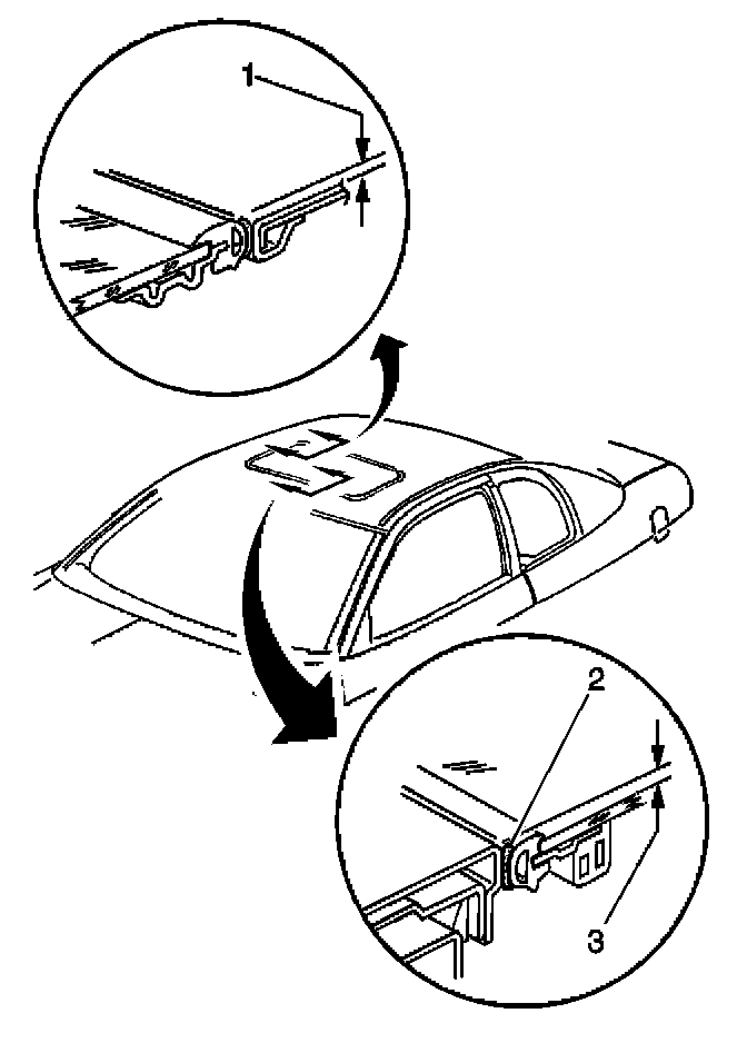 - Adjust the front of the sunroof window (2) flush to 1 mm (0.04 in) below the top surface of the roof panel.