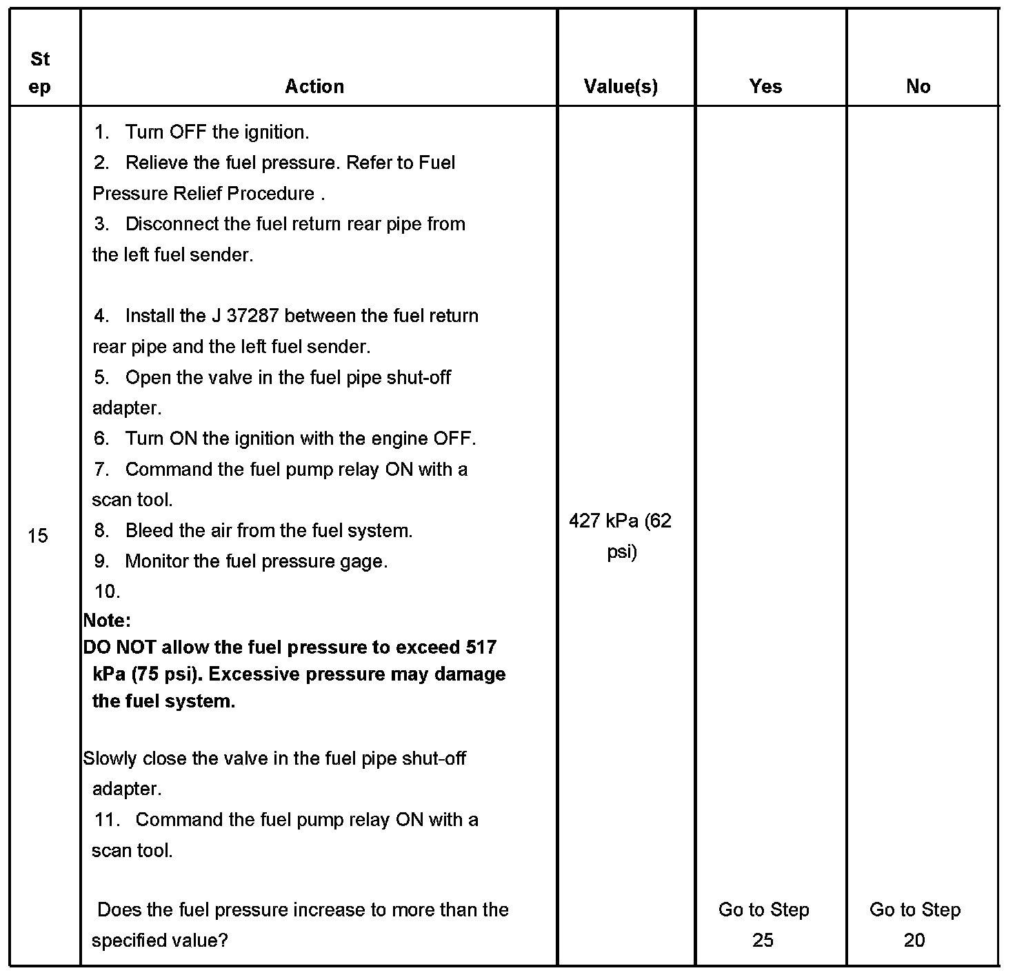 15. This step determines if the fuel pressure regulator, or the fuel pump is the cause of the low fuel pressure.