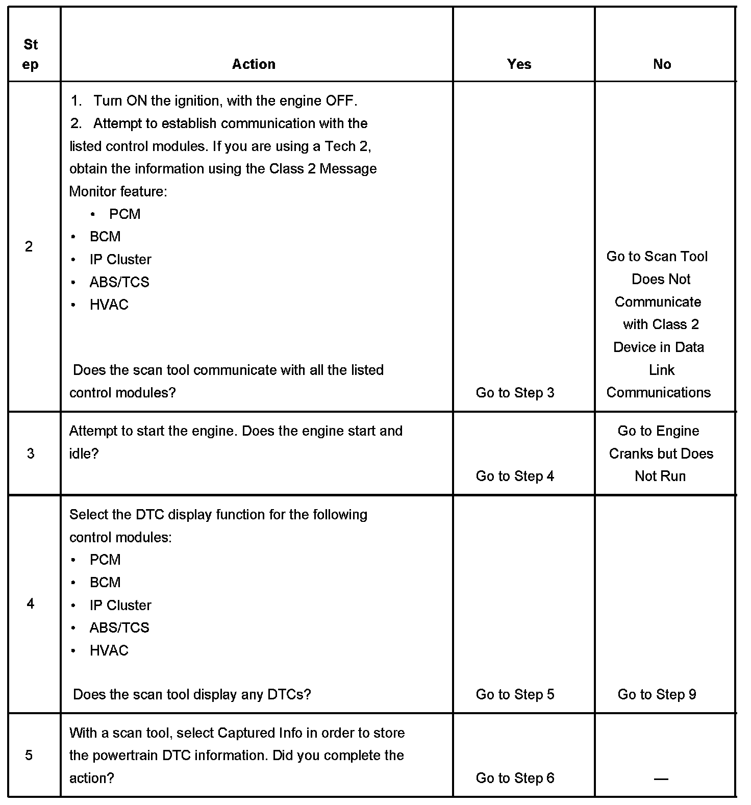 2. Lack of communication may be because of a partial or a total malfunction of the Class 2 serial data circuit. The specified procedure determines the particular condition.