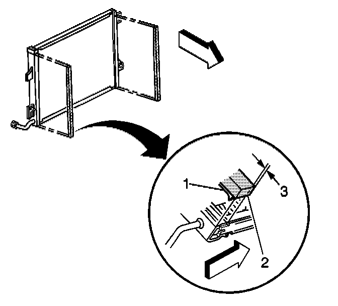 3. Lower the condenser to secure the condenser tabs (1) to the radiator slots (2).