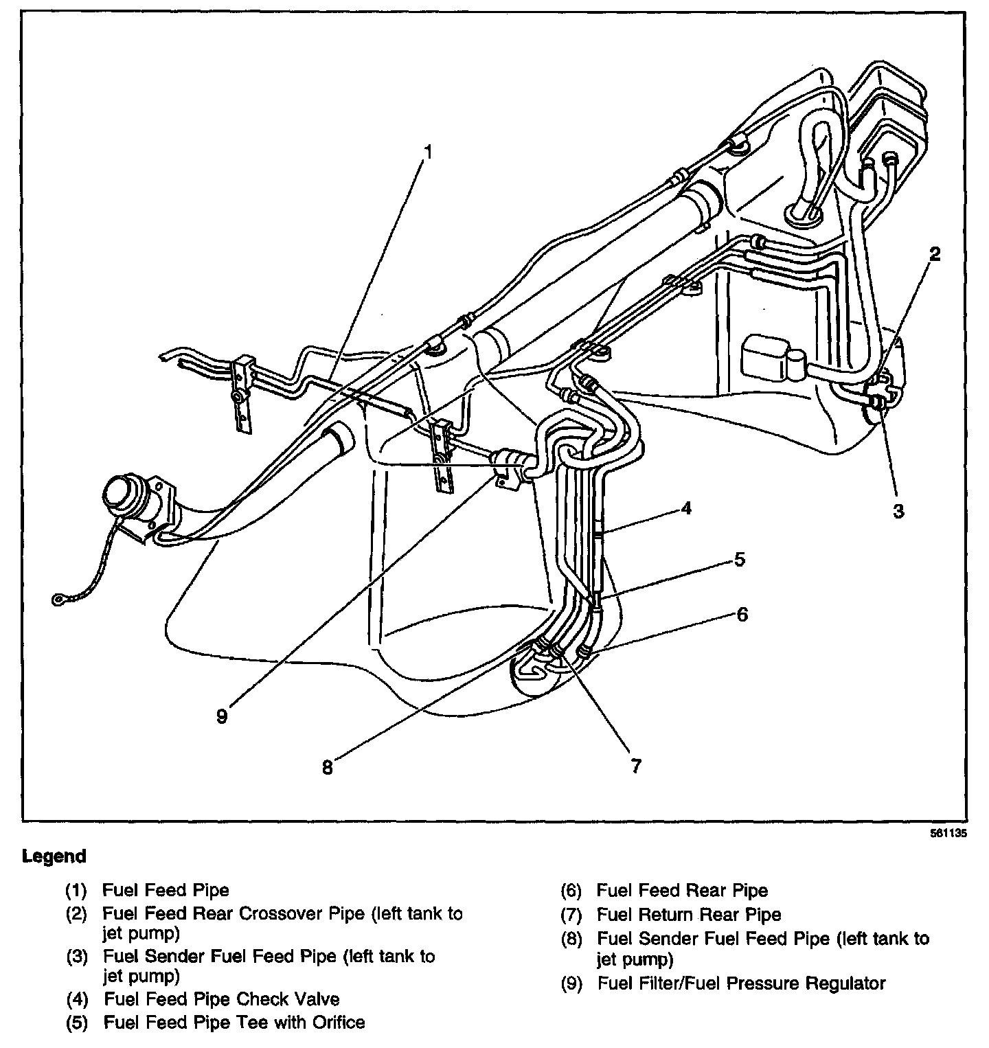 - The rear fuel pipes are located from the left fuel sender assembly to the fuel filter/pressure regulator assembly and from the left fuel sender assembly to the right fuel sender assembly. The rear fuel pipes connecting the fuel sender assemblies are constructed of sections of steel pipe and nylon pipe. The rear fuel pipes connecting the left fuel sender assembly to the fuel filter/pressure regulator assembly are constructed of nylon. The rear fuel feed pipe has an integral check valve in order to maintain the fuel system pressure in the feed pipe.
