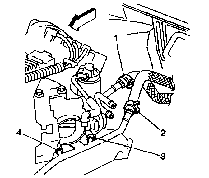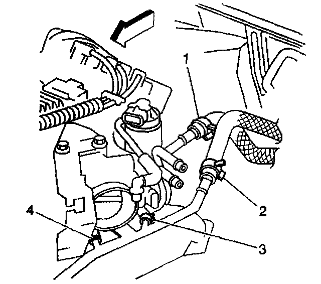 9. Remove the thermostat bypass pipe coolant hoses (3, 4) from the throttle body.