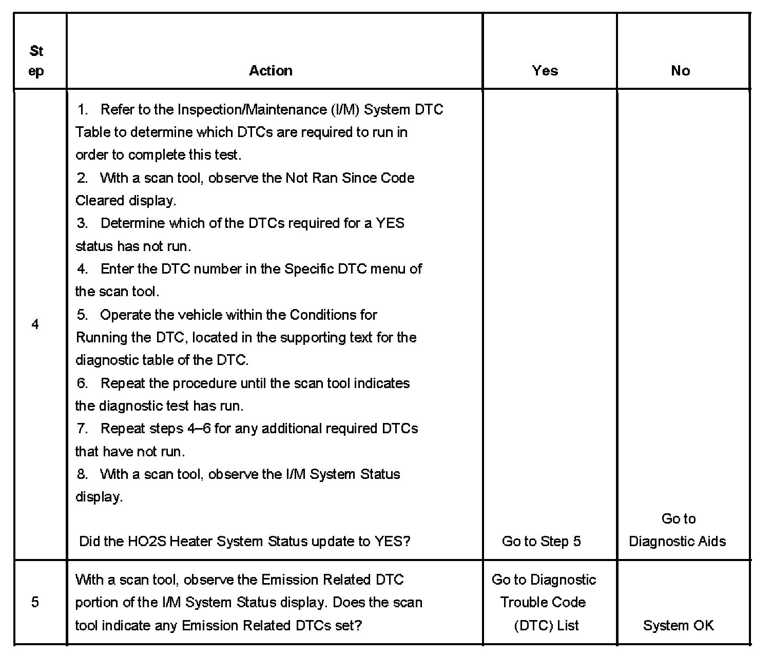 5. The I/M System Status only reports on whether or not a diagnostic has run, not the outcome of the test. If any emission related DTC sets after the tests are complete, the DTC will require diagnosis.