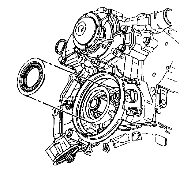 12. Pry out the crankshaft front oil seal with a flat-bladed tool such as a large screwdriver. Use care to avoid damaging the crankshaft front oil seal bore or the crankshaft front oil seal contact surfaces.