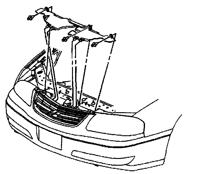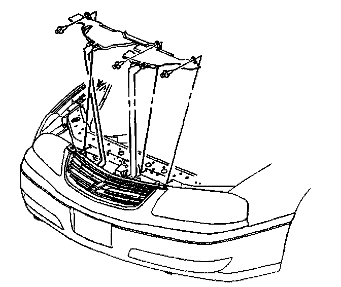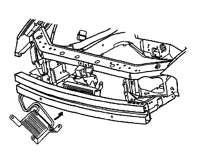 8. Position the radiator air baffle to the vehicle. Tilt the rear of the air baffle upward slightly. Position the upper clip of the air baffle to the lower edge of the front fascia support C-channel.