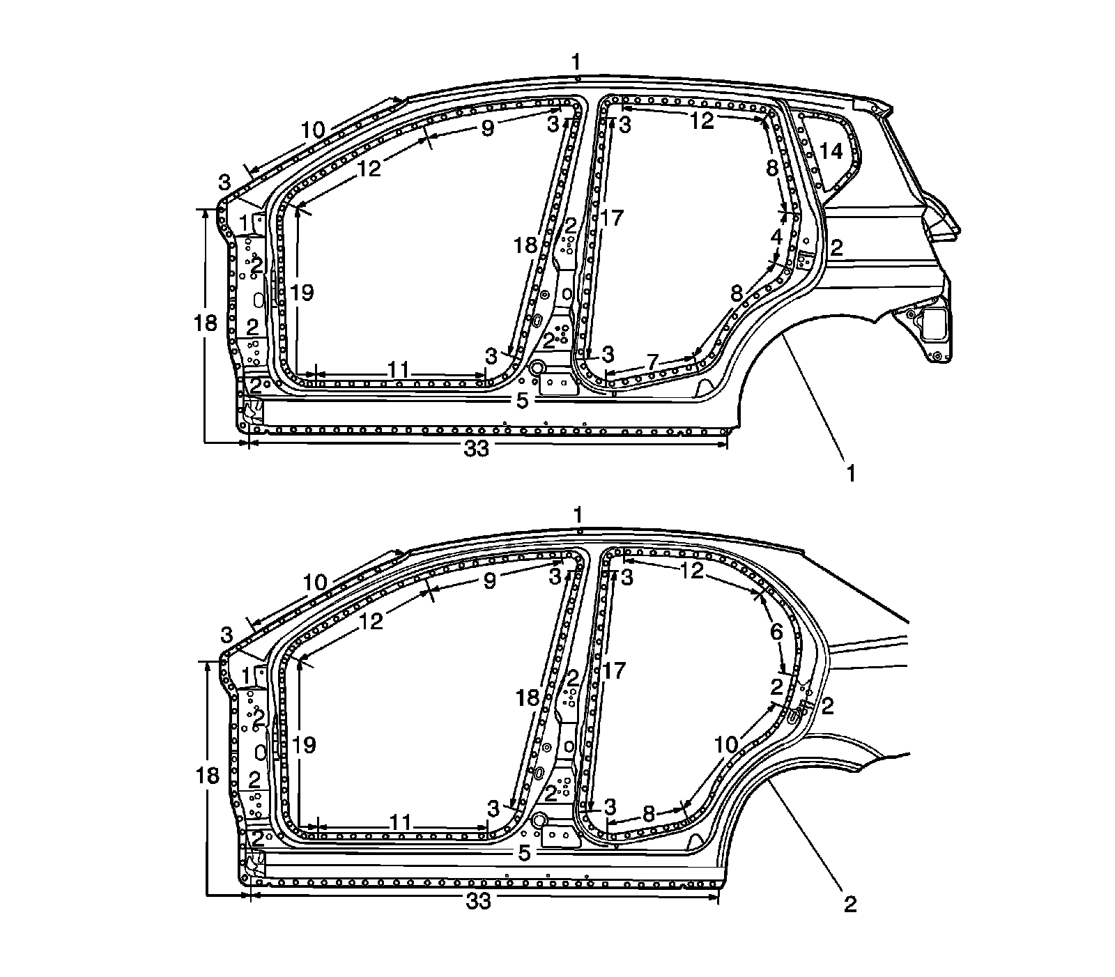 Important: The number of spot welds needed in each location is shown in illustration.