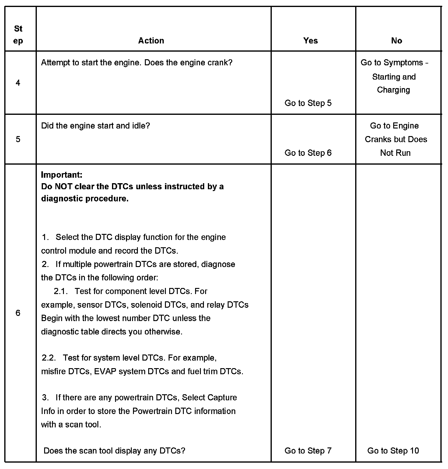 The numbers below refer to the step numbers on the diagnostic table.
