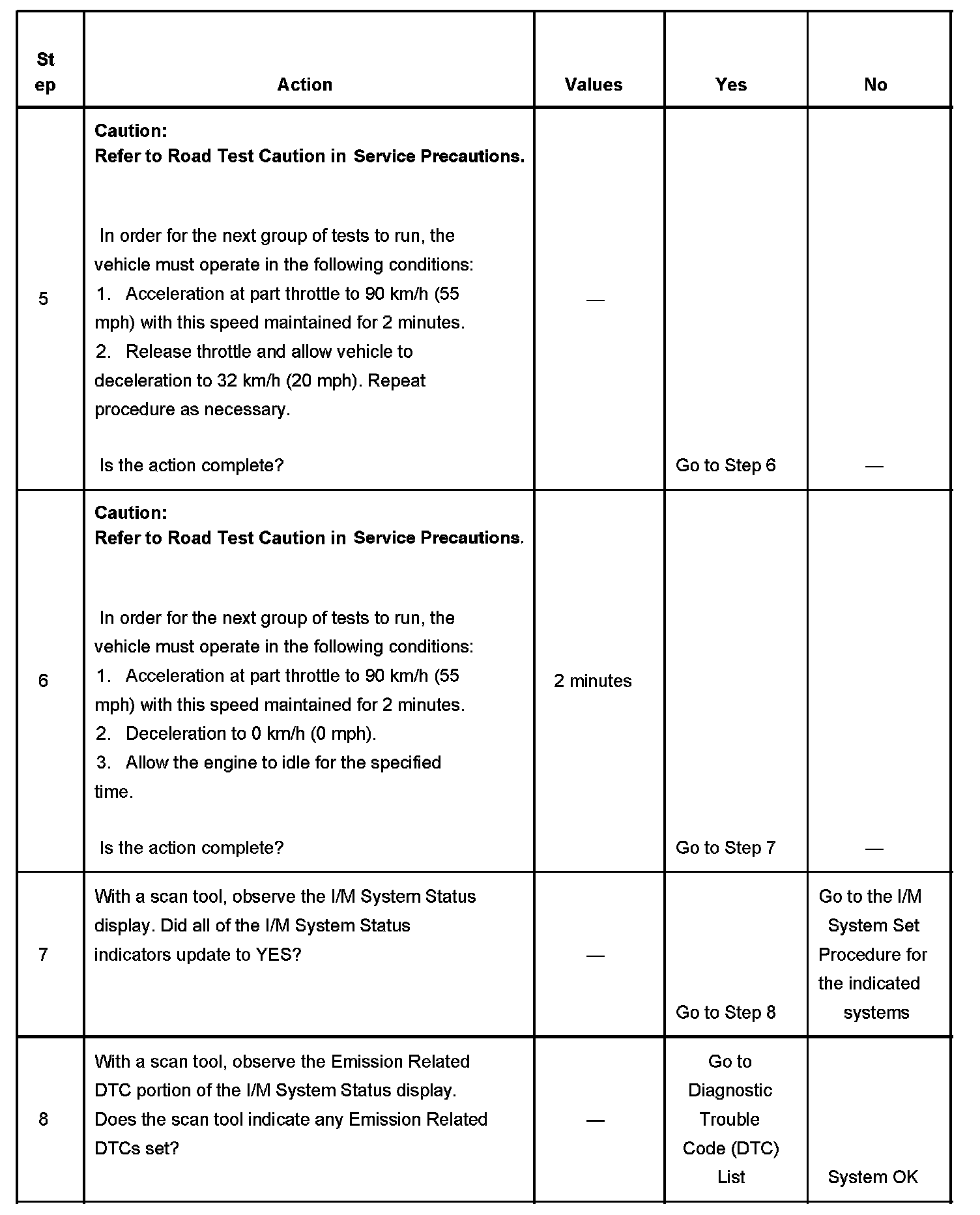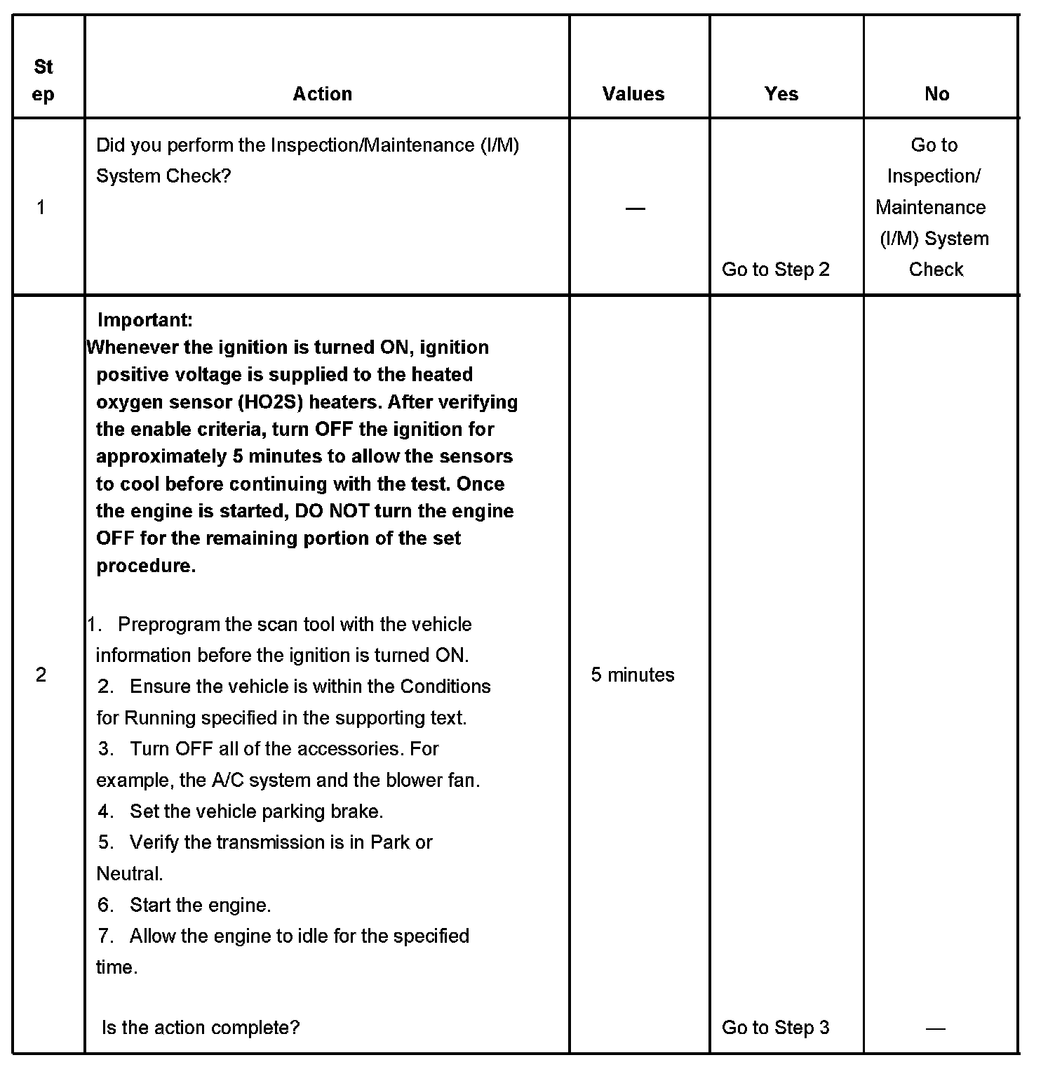The scan tool can be used to monitor each of the I/M System Status indicators during the I/M Complete System Set Procedure. When all of the indicators for a test step have updated to YES, testing can move on to the next step even if the remaining portion of the test is not complete. For example, step 3 is designed to run the HO2S test. The procedure instructs the technician to operate the vehicle in the enable conditions for 8-10 minutes. If the test has updated to YES within 4 minutes, it is not necessary to continue with the enable conditions and testing can advance to the next step.