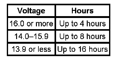 3. Battery chargers vary in the amount of voltage and current provided. The time required for the battery to accept a measurable charger current at various voltages may be a follows: