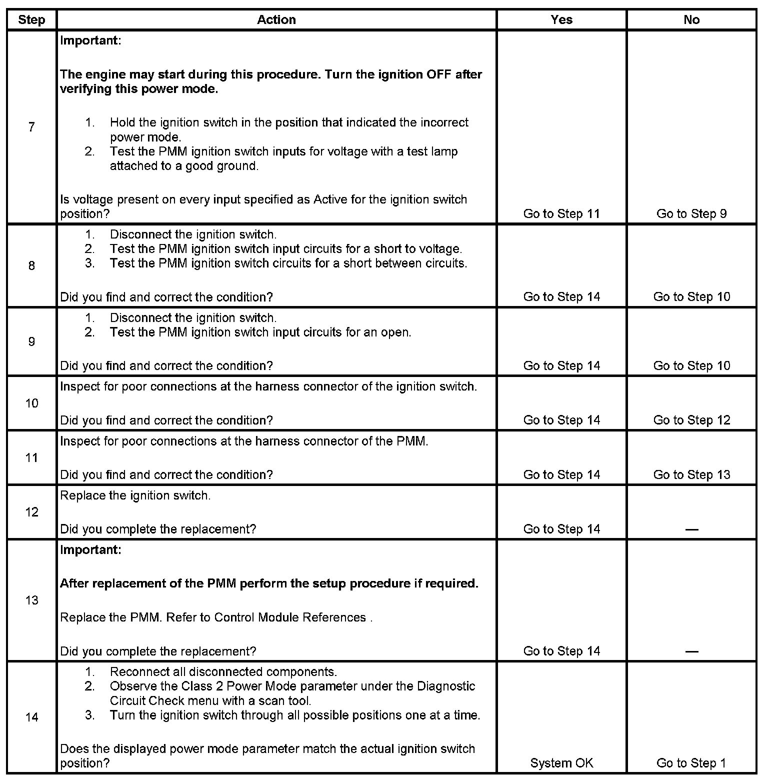 Normal vehicle class 2 communications and module operations will not begin until the system power mode has been identified. Discrete circuits from the ignition switch are monitored by the power mode master (PMM) module in order to determine the correct power mode. The PMM communicates the system power mode to all class 2 modules on the class 2 serial data line. The body control module (BCM) is the PMM on this vehicle. Use this table if the class 2 power mode does not match the ignition switch position.