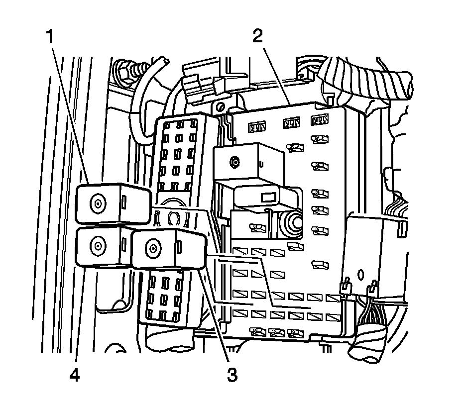 1. Install the relay (1, 3, and or 4) into the I/P wire harness junction block (2).