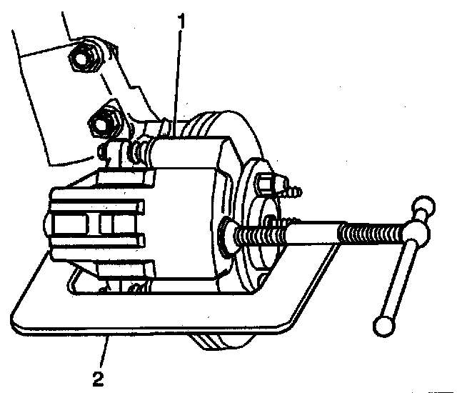6.1. Install a large C-clamp (2) over the top of the caliper housing and against the back of the outboard pad.