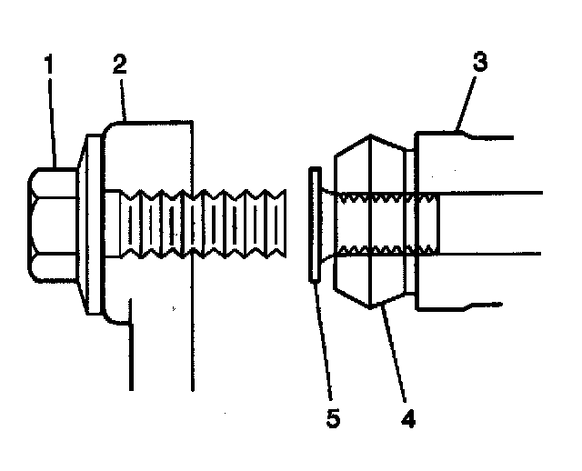 4. Install the caliper bolts (1) thru the caliper (2) and into the caliper pins (5).